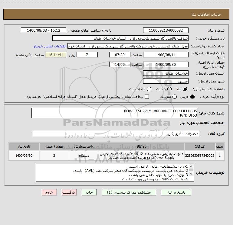 شرح کلی نیاز: POWER SUPPLY IMPEDANCE FOR FIELDBUS P/N: DF53