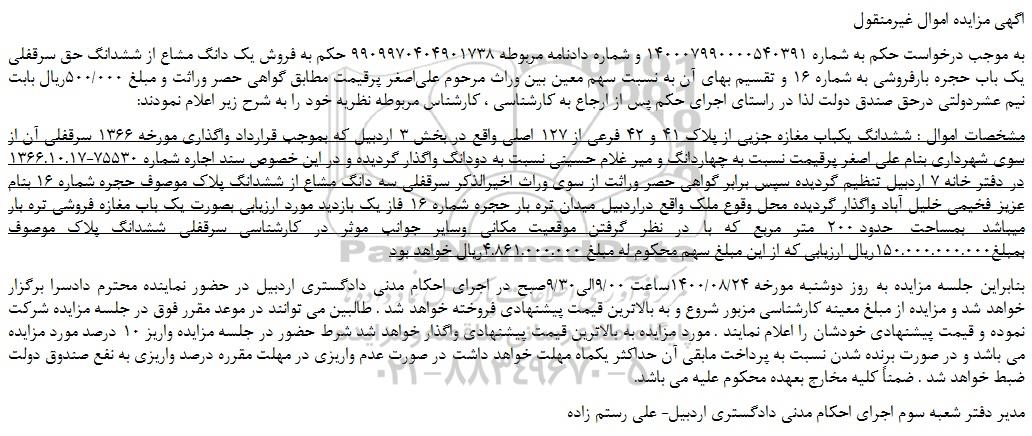 مشخصات اموال : ششدانگ یکباب مغازه جزیی از پلاک 41 و 42 فرعی از 127 اصلی واقع در بخش 3 اردبیل که بموجب قرارداد واگذاری مورخه 1366 سرقفلی آن از سوی شهرداری بنام علی اصغر پرقیمت نسبت به چهاردانگ و میر غلام حسینی نسبت به دودانگ واگذار گردیده و در این خصوص سند اجاره شماره 75530-1366.10.17 در دفتر خانه 7 اردبیل تنظیم گردیده سپس برابر گواهی حصر وراثت از سوی وراث اخیرالذکر سرقفلی سه دانگ مشاع از ششدانگ پلاک موصوف حجره شماره 16 بنام عزیز فخیمی خلیل آباد واگذار گردیده محل وقوع ملک واقع دراردبیل میدان تره بار حجره شماره 16 فاز یک بازدید مورد ارزیابی بصورت یک باب مغازه فروشی تره بار میباشد بمساحت حدود 200 متر مربع که با در نظر گرفتن موقعیت مکانی وسایر جوانب موثر در کارشناسی سرقفلی ششدانگ پلاک موصوف بمبلغ150.000.000.000ریال ارزیابی که از این مبلغ سهم محکوم له مبلغ 4.861.000.000ریال خواهد بود