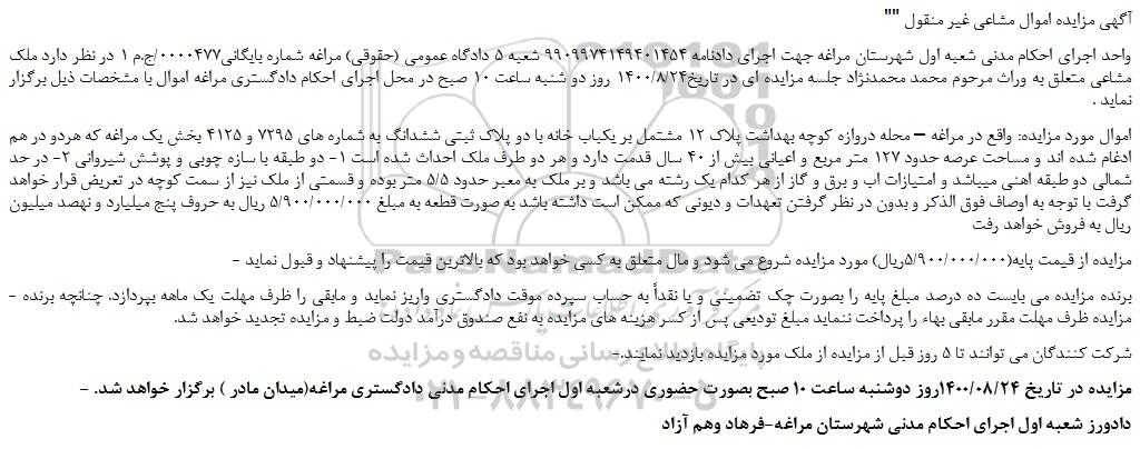 واحد اجرای احکام مدنی شعبه اول شهرستان مراغه جهت اجرای دادنامه 9909974149401454 شعبه 5 دادگاه عمومی (حقوقی) مراغه شماره بایگانی0000477/ج.م 1 در نظر دارد ملک مشاعی متعلق به وراث مرحوم محمد محمدنژاد جلسه مزایده ای در تاریخ1400/8/24 روز دو شنبه ساعت 10 صبح در محل اجرای احکام دادگستری مراغه اموال با مشخصات ذیل برگزار نماید .