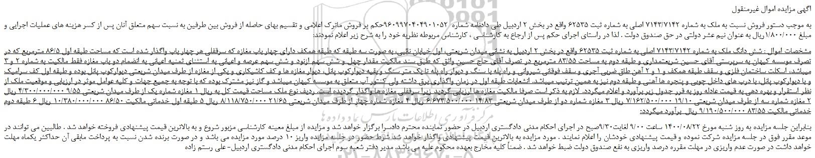 مشخصات اموال : شش دانگ ملک به شماره 7143/7142 اصلی به شماره ثبت 62535 واقع در بخش 2 اردبیل به نشانی میدان شریعتی، اول خیابان نائبی، به صورت سه طبقه که طبقه همکف دارای چهار باب مغازه که سرقفلی هر چهار باب واگذار شده است که مساحت طبقه اول 86/5 مترمربع که در تصرف موسسه کیهان به سرپرستی آقای حسین شریعتمداری و طبقه دوم به مساحت 83/55 مترمربع در تصرف آقای حاج حسین واثق که طبق سند مالکیت مقدار چهل و شش سهم ازنود و شش سهم عرصه و اعیانی به استثنای ثمنیه اعیانی به انضمام دو باب مغازه فقط مالکیت به شماره 2 و 3 میباشد، اسکلت ساختمان فلزی و سقف طبقه همکف و 1 و 2 آهن طاق ضربی آجری و سقف فوقانی شیروانی و راه پله با سنگ و دیوار راه پله تا یک متر سنگ و بقیه دیوارکوب پانل، دیوار مغازه ها و کف کاشیکاری و یکی از مغازه از طرف میدان شریعتی دیوارکوب پانل بوده و طبقه اول کف سرامیک و با دیوارکوب پانل، با درب های داخل چوبی و پنجره ها آهنی و طبقه دوم نیز به همین ترتیب میباشد. انشعابات طبقه اول در زمان واگذاری برق داشته ولی کنتور آب متعلق به موسسه کیهان میباشد و گاز نیز مشترک بوده که با توجه به جمیع جهات و کلیه عوامل موثر در ارزیابی و موقعیت ملک از نظر استقرار و بهره دهی به قیمت عادله روز به قرر جدول زیر برآورد و اعلام میگردد. لازم به ذکر است صرفا مالکیت مغازه ها ارزیابی گردید زیرا سرقفلی مغازه ها واگذار گردیده است. ردیف نوع ملک مساحت قیمت کل به ریال 1 مغازه شماره یک از طرف میدان شریعتی 9/55 4/300/000/000 ریال 2 مغازه شماره سه از طرف میدان شریعتی 19/10 7/162/500/000 ریال 3 مغازه شماره دو از طرف میدان شریعتی 14/83 6/673/500/000 ریال 4 مغازه شماره چهار از طرف میدان شریعتی 21/65 8/118/750/000 ریال 5 طبقه اول خدماتی مالکیت 86/50 10/380/000/000 ریال 6 طبقه دوم خدماتی مالکیت 83/55 9/190/500/000 ریال  برآورد میگردد؛