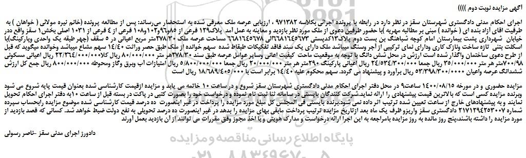 اجرای احکام مدنی دادگستری شهرستان سقز در نظر دارد در رابطه با پرونده اجرائی بکلاسه 971382 ، ارزیابی عرصه ملک معرفی شده به استحضار می‏رساند: پس از مطالعه پرونده (خانم نیره مولائی ( خواهان ) به طرفیت اقای آزاد بنده ای ( خوانده ) مبنی بر مطالبه مهریه )با حضور طرفین دعوی از ملک مورد نظر بازدید و معاینه به عمل آمد  پلاک129 فرعی از 85و96و102و108 فرعی از 4 فرعی از 1031 اصلی بخش1 سقز واقع ددر خیابان  شهرداری پشت بیمارستان امام کوچه شباهنگ بن بست دوم پلاک13کدپستی 6681645673الی 6681645678 مساحت عرصه ملک 278/30متر مربع اعیانی در 5 سقف (چهر طبقه یک واحدی وپارکینگ)با اسکلت بتنی  تازه ساخت ونازک کاری ودارای نمای ترکیبی از آجر وسنگ میباشد ملک دارای یک سند فاقد تفکیکات طبقاط شده  سهم خوانده از ملک طبق حصر وراثت 14/40 سهم مشاع میباشد وخوانده میگوید که قبل از طرح دعوی ساختمان واگذار شده است ارزش در محل شش دانگ با توجه به موقعیت ماحت  کیفیت اعانی وسایر عوامل عرصه طبق سند 278/30هر متر 80/000/000 ریال کلا22/264/000/000 ریال اعیانی مسکونی 700/98متر هر متر 35/000/000 ریال جمعا 24/534/300/000 ریال اعیانی پارکینگ 290متر هر متر 20/000/000 ریال جمعا 5/800/000/000 ریال امتیازات آب وبرق وگاز ومحوطه 800/000/000 ریال جمع کل ارزش ششدانگ عرصه واعیان 53/398/300/0000 ریال برآورد و پیشنهاد می گردد. سهم محکوم علیه 14/40 برابر است با 18/689/405/000 ریال است