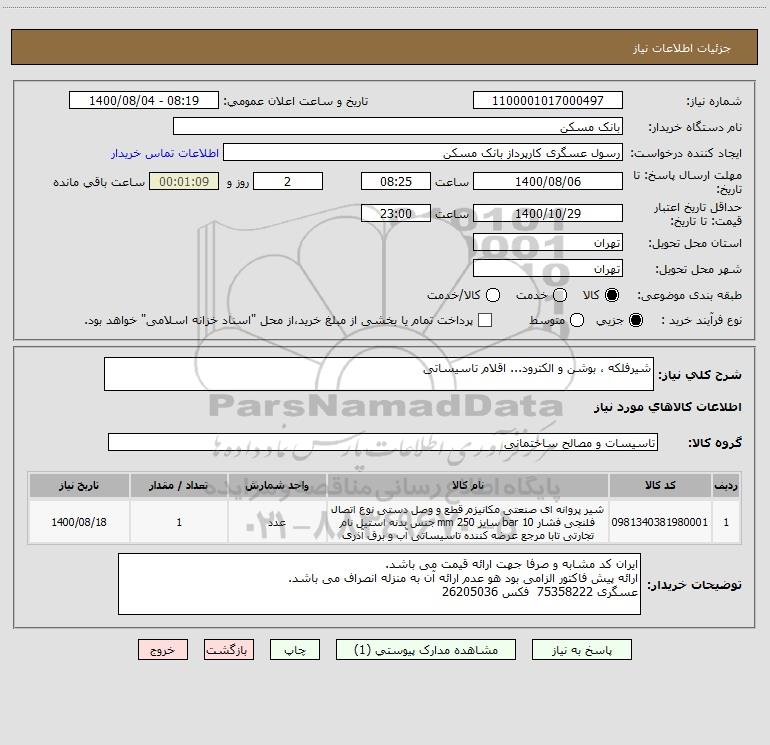 شرح کلی نیاز: شیرفلکه ، بوشن و الکترود... اقلام تاسیساتی