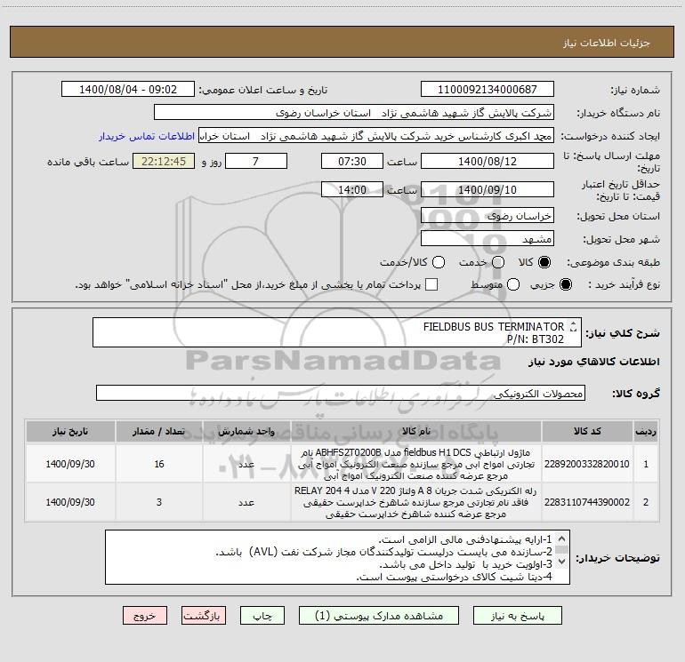 نام دستگاه خریدار:شرکت پالایش گاز شهید هاشمی نژاد استان خراسان رضوی