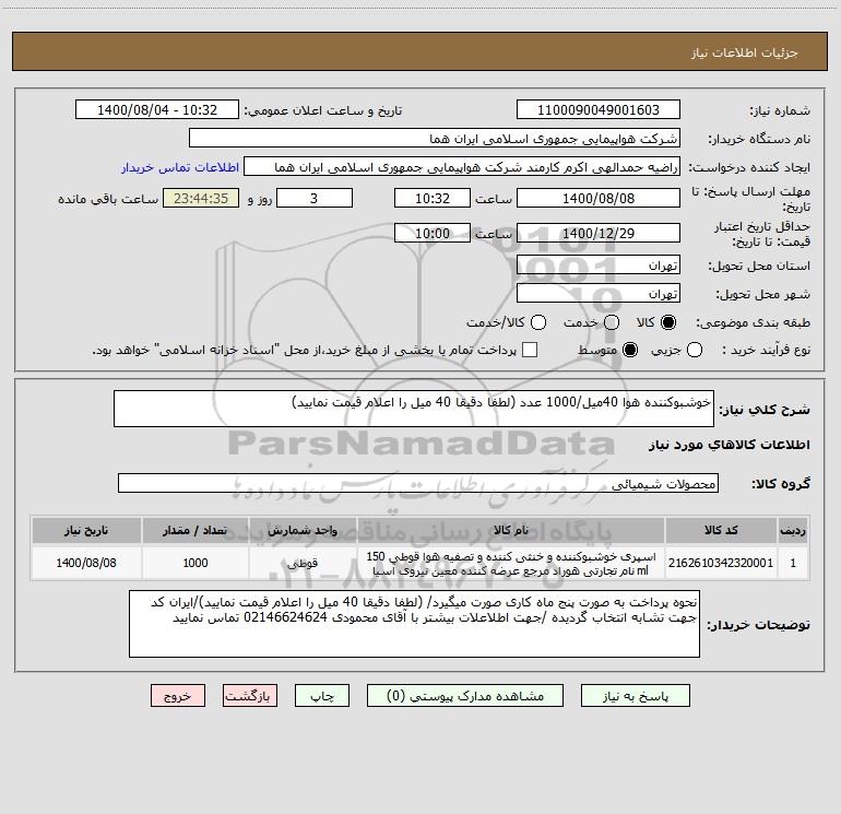شرح کلی نیاز: خوشبوکننده هوا 40میل/1000 عدد (لطفا دقیقا 40 میل را اعلام قیمت نمایید)
