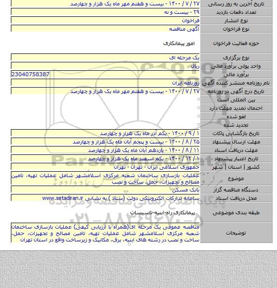 مناقصه عمومی یک مرحله ای(همراه با ارزیابی کیفی) عملیات بازسازی ساختمان شعبه مرکزی اسلامشهر شامل عملیات تهیه، تامین مصالح و تجهیزات، حمل، ساخت و نصب در رشته های ابنیه، برق، مکانیک و زیرساخت واقع در استان تهران