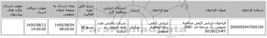 مناقصه، فراخوان ارزیابی کیفی مناقصه عمومی یک مرحله ای RND-0018015-MY, فراخوان ارزیابی کیفی مناقصه عمومی یک مرحله ای RND-0018015-MY