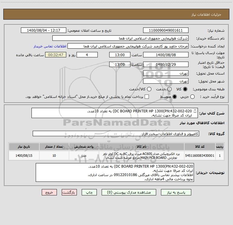 شرح کلی نیاز: DC BOARD PRINTER HP 1300(PN:432-002-020) به تعداد 10عدد. ایران کد صرفا جهت تشابه. اطلاعات بیشتر توضیحات مطالعه شود.