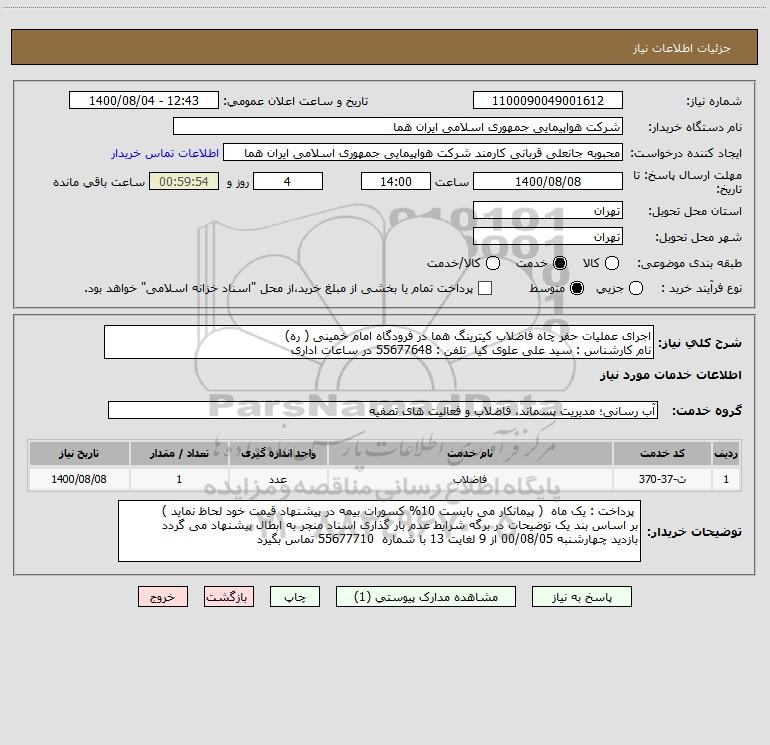 شرح کلی نیاز: اجرای عملیات حفر چاه فاضلاب کیترینگ هما در فرودگاه امام خمینی ( ره)
