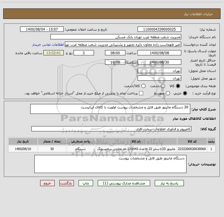 شرح کلی نیاز: 30 دستگاه مانیتور طبق فایل و مشخصات پیوست اولویت با کالای ایرانیست