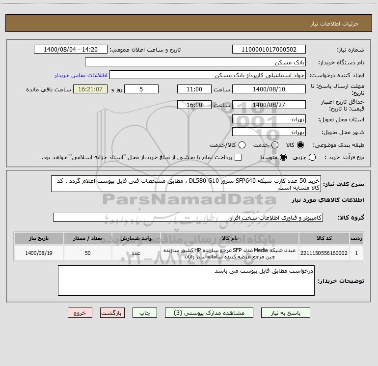 استعلام خرید 50 عدد کارت شبکه SFP640 سرور DL580 G10 ، مطابق مشخصات فنی فایل پیوست اعلام گردد . کد کالا مشابه است, استعلام خرید 50 عدد کارت شبکه SFP640 سرور DL580 G10 ، مطابق مشخصات فنی فایل پیوست اعلام گردد . کد کالا مشابه است
