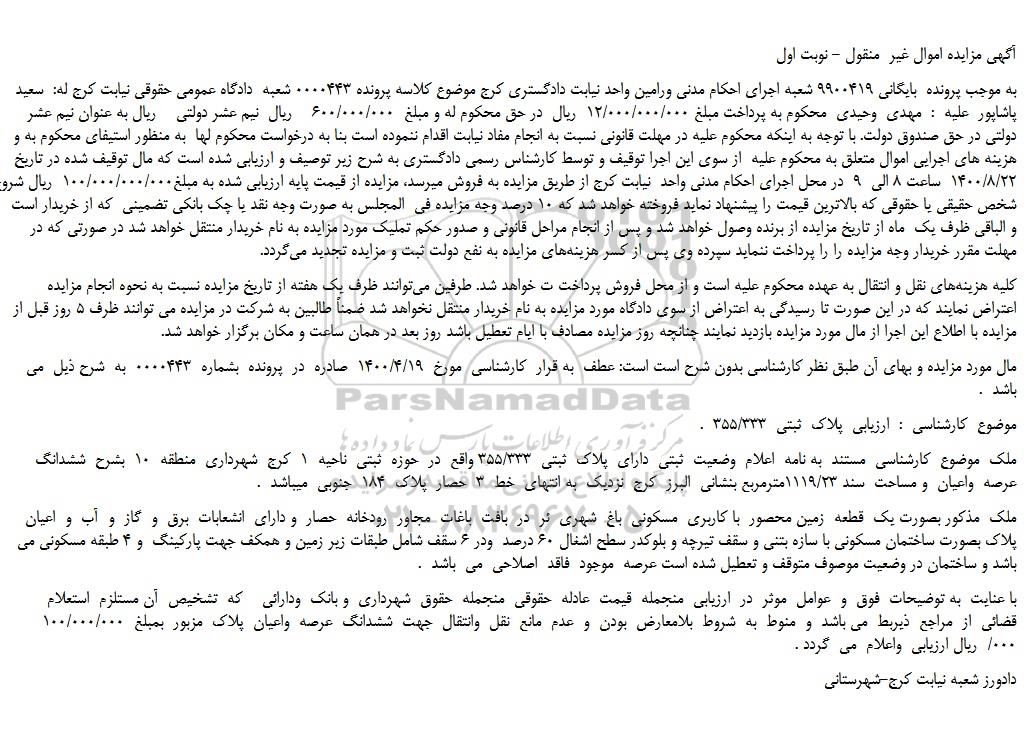 به موجب پرونده بایگانی 9900419 شعبه اجرای احکام مدنی ورامین واحد نیابت دادگستری کرج موضوع کلاسه پرونده 0000443 شعبه دادگاه عمومی حقوقی نیابت کرج له: سعید پاشاپور علیه : مهدی وحیدی محکوم به پرداخت مبلغ 12/000/000/000 ریال در حق محکوم له و مبلغ 600/000/000 ریال نیم عشر دولتی ریال به عنوان نیم عشر دولتی در حق صندوق دولت. با توجه به اینکه محکوم علیه در مهلت قانونی نسبت به انجام مفاد نیابت اقدام ننموده است بنا به درخواست محکوم لها به منظور استیفای محکوم به و هزینه های اجرایی اموال متعلق به محکوم علیه از سوی این اجرا توقیف و توسط کارشناس رسمی دادگستری به شرح زیر توصیف و ارزیابی شده است که مال توقیف شده در تاریخ 1400/8/22 ساعت 8 الی 9 در محل اجرای احکام مدنی واحد نیابت کرج از طریق مزایده به فروش میرسد، مزایده از قیمت پایه ارزیابی شده به مبلغ100/000/000/000 ریال شروع و به هر شخص حقیقی یا حقوقی که بالاترین قیمت را پیشنهاد نماید فروخته خواهد شد که ۱۰ درصد وجه مزایده فی المجلس به صورت وجه نقد یا چک بانکی تضمینی که از خریدار است و الباقی ظرف یک ماه از تاریخ مزایده از برنده وصول خواهد شد و پس از انجام مراحل قانونی و صدور حکم تملیک مورد مزایده به نام خریدار منتقل خواهد شد در صورتی که در مهلت مقرر خریدار وجه مزایده را را پرداخت ننماید سپرده وی پس از کسر هزینه های مزایده به نفع دولت ثبت و مزایده تجدید می گردد.
