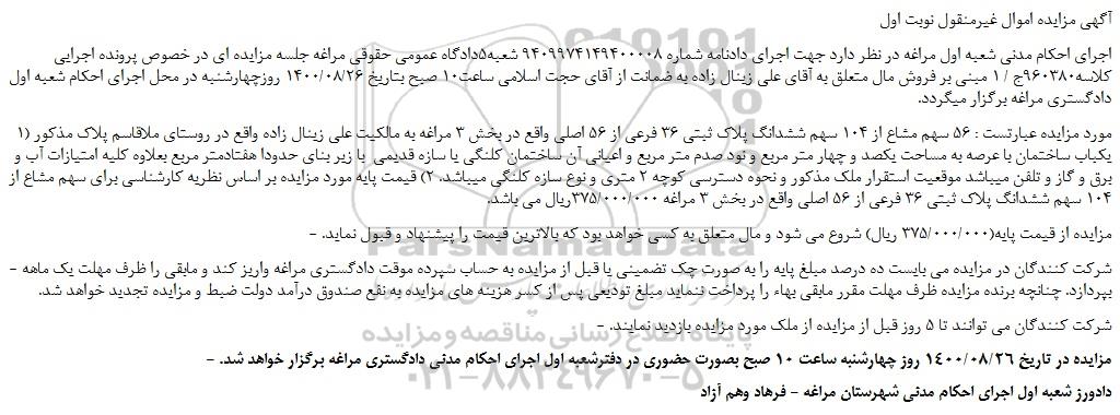 - مزایده در تاریخ 1400/08/26 روز چهارشنبه ساعت 10 صبح بصورت حضوری در دفترشعبه اول اجرای احکام مدنی دادگستری مراغه برگزار خواهد شد.