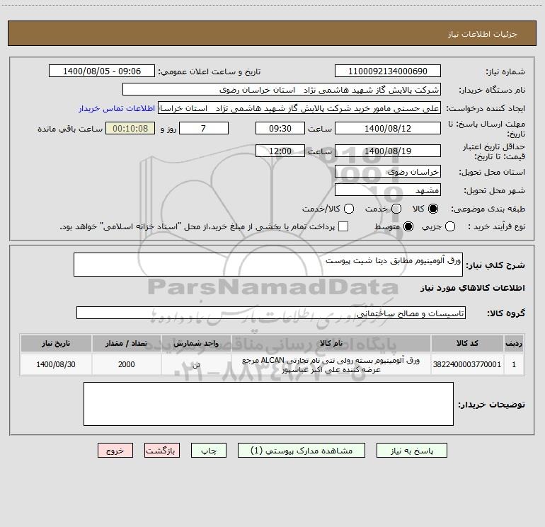 شرح کلی نیاز: ورق آلومینیوم مطابق دیتا شیت پیوست