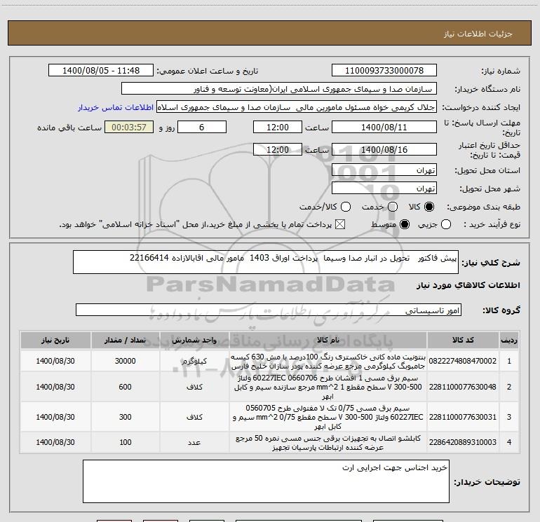 شرح کلی نیاز: پیش فاکتور تحویل در انبار صدا وسیما پرداخت اوراق 1403 مامور مالی اقابالازاده 22166414