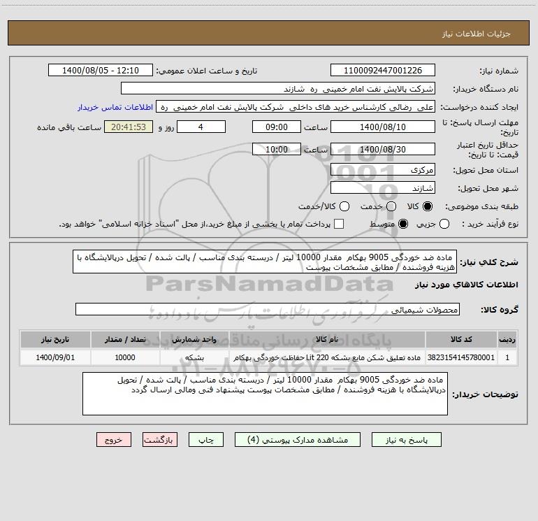 شرح کلی نیاز: ماده ضد خوردگی 9005 بهکام مقدار 10000 لیتر / دربسته بندی مناسب / پالت شده / تحویل درپالایشگاه با هزینه فروشنده / مطابق مشخصات پیوست