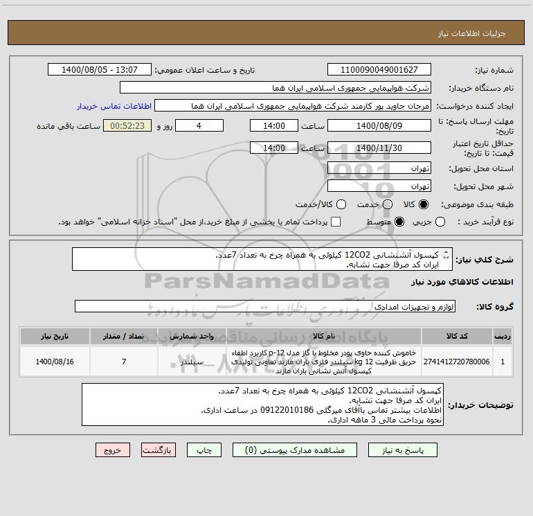 توضیحات خریدار:کپسول آتشنشانی 12CO2 کیلوئی به همراه چرخ به تعداد 7عدد. ایران کد صرفا جهت تشابه. اطلاعات بیشتر تماس باآقای میرگلی 09122010186 در ساعت اداری. نحوه پرداخت مالی 3 ماهه اداری.
