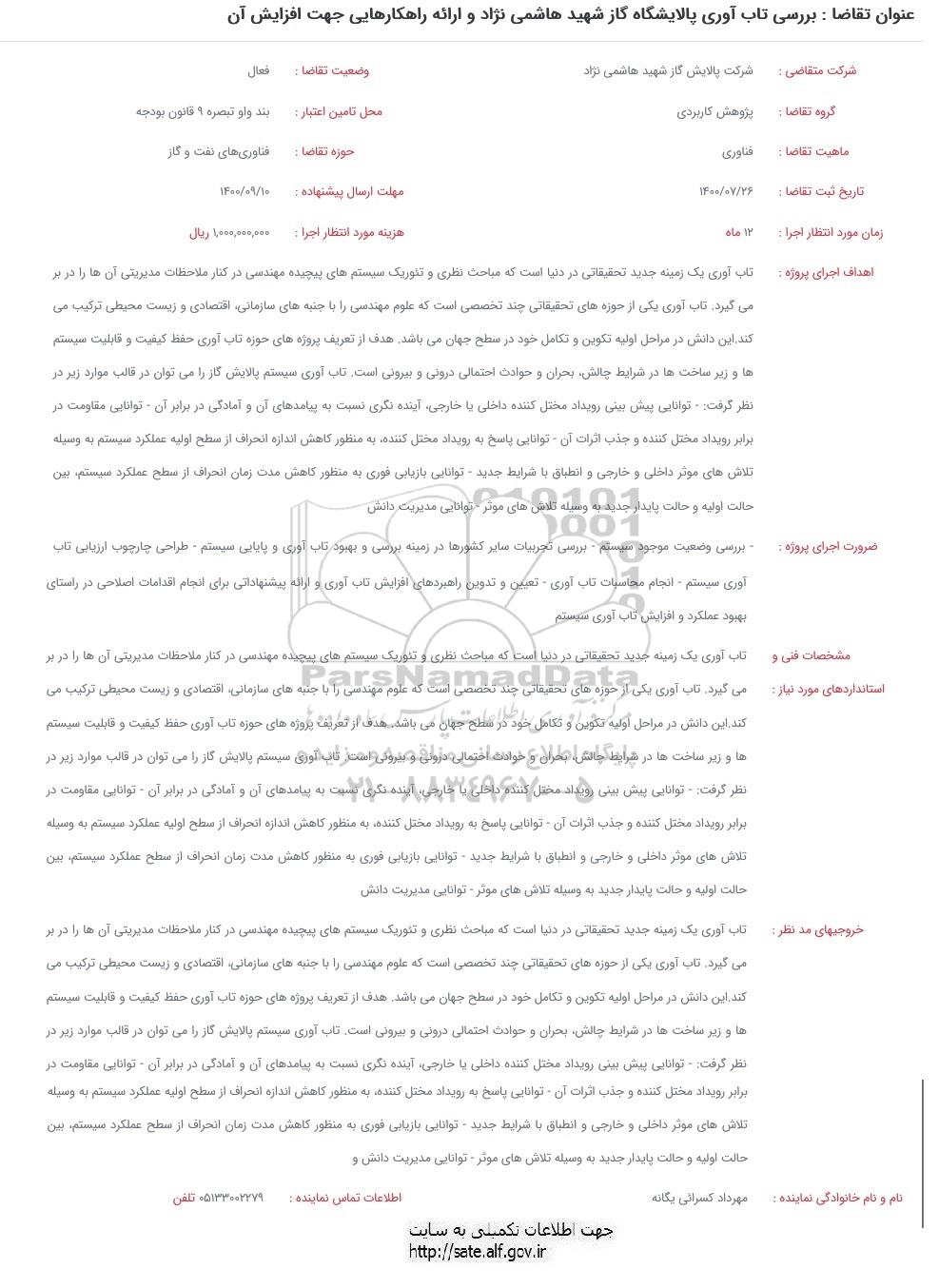 شرکت متقاضی: شرکت پالایش گاز شهید هاشمی نژاد