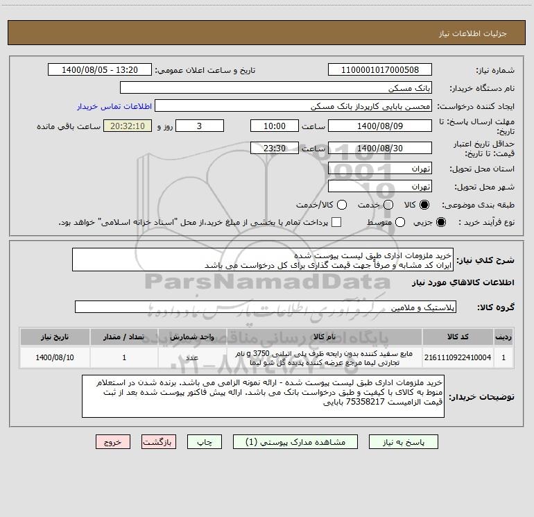 شرح کلی نیاز: خرید ملزومات اداری طبق لیست پیوست شده