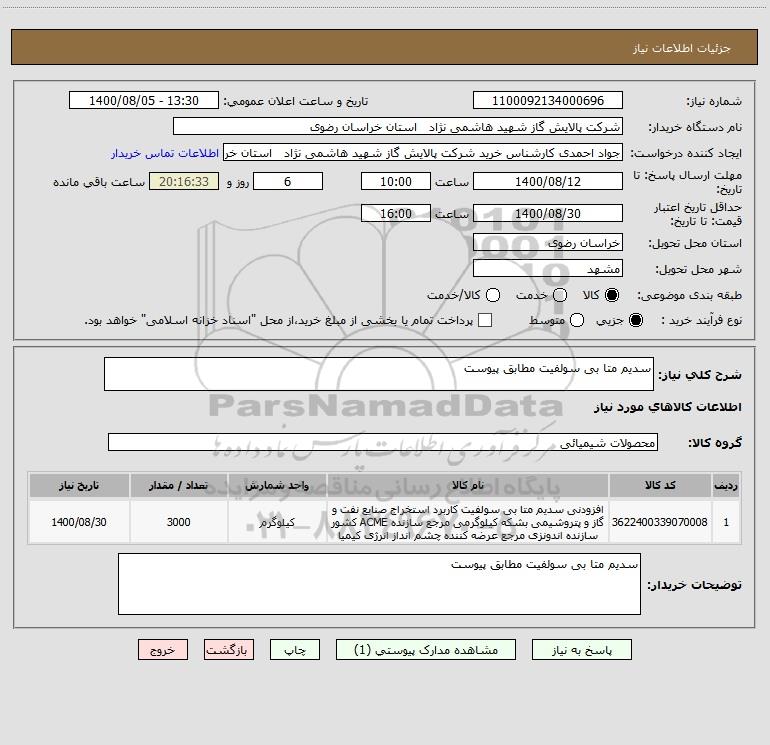 شرح کلی نیاز: سدیم متا بی سولفیت مطابق پیوست