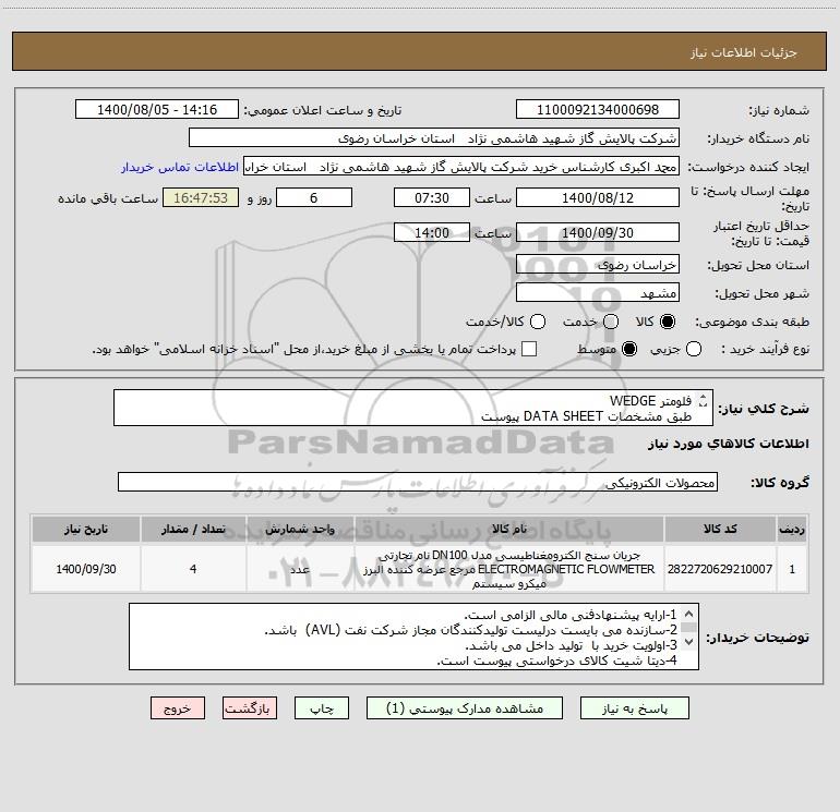 نام دستگاه خریدار:شرکت پالایش گاز شهید هاشمی نژاد استان خراسان رضوی