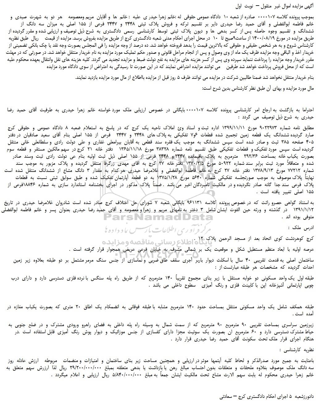 بموجب پرونده کلاسه 0000107  صادره از شعبه 10  دادگاه عمومی حقوقی  له :خانم زهرا حیدر ی  علیه  : خانم  ها  و آقایان  مریم ومعصومه    هر  دو  به  شهرت  صیدی  و خانم  فاطمه  ابوالفضلی  و  آقای  حمید  رضا  حیدری  دایر  بر  تقسیم  ترکه  و  فروش  پلاک  ثبتی  2448  و  2447  فرعی  از  155  اصلی  به  میزان  سه  دانگ  از  ششدانگ  و  تقسیم  وجوه  حاصله  پس از  کسر  بدهی  ها  و  دیون  پلاک  ثبتی  توسط  کارشناسی  رسمی  دادگستری  به  شرح ذیل توصیف و ارزیابی شده و مقرر گردیده از طریق مزایده در مورخ 1400/08/19 از ساعت9صبح تا  10  در محل اجرای احکام مدنی شعبه دادگستری کرج از طریق مزایده بفروش برسد. مزایده از قیمت    ریال  طبق نظریه کارشناس شروع و به هر شخص حقیقی و حقوقی که بالاترین قیمت را بدهد فروخته خواهد شد. ده درصد از وجه مزایده را فی المجلس بصورت وجه نقد یا چک بانکی تضمینی از خریدار اخذ و الباقی وجه مزایده ظرف یک ماه از وی وصول و پس از انجام مراحل قانونی و صدور حکم تملیک مورد مزایده به نام خریدار منتقل خواهد شد. در صورتی که در مهلت مقرر خریدار وجه مزایده را پرداخت ننماید سپرده وی پس از کسر هزینه های مزایده به نفع دولت ضبط و مزایده تجدید می گردد. کلیه هزینه های نقل وانتقال بعهده محکوم علیه است که از محل فروش پرداخت خواهد شد طرفین    می توانند مزایده اعتراض نمایند که در این صورت تا رسیدگی به اعتراض از سوی دادگاه مورد مزایده