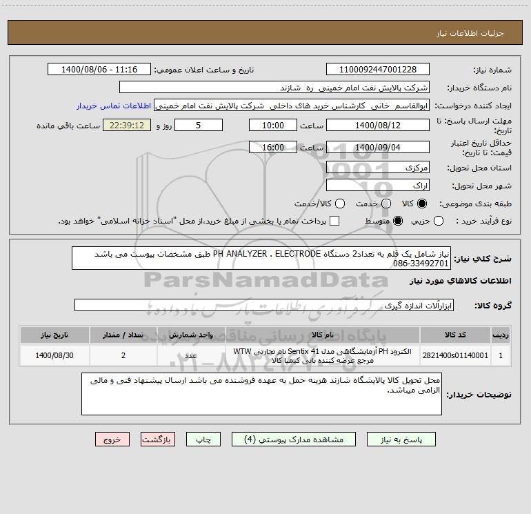 شرح کلی نیاز: نیاز شامل یک قلم به تعداد2 دستگاه PH ANALYZER . ELECTRODE طبق مشخصات پیوست می باشد 33492701-086
