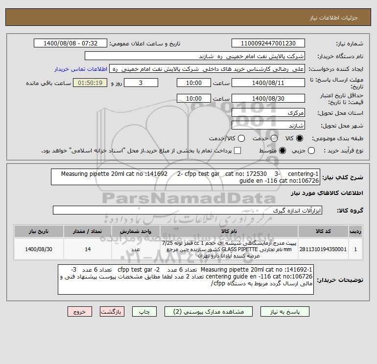 شرح کلی نیاز: 1-Measuring pipette 20ml cat no :141692 2- cfpp test gar cat no: 172530 3- centering guide en -116 cat no:106726