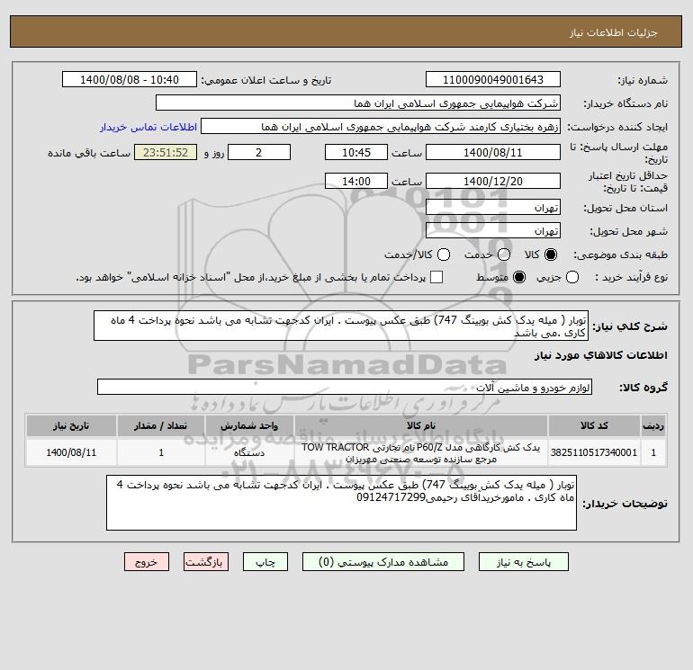شرح کلی نیاز: توبار ( میله یدک کش بویینگ 747) طبق عکس پیوست . ایران کدجهت تشابه می باشد نحوه پرداخت 4 ماه کاری .می باشد