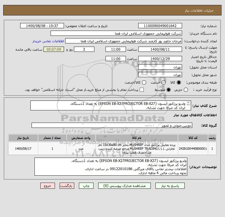 توضیحات خریدار:وئدیو پرژکتور ایسون (EPSON EB-X27PROJECTOR EB-X27) به تعداد 1دستگاه. ایران کد صرفا جهت تشابه. اطلاعات بیشتر تماس باآقای میرگلی 09122010186 در ساعت اداری. نحوه پرداخت مالی 4 ماهه اداری.