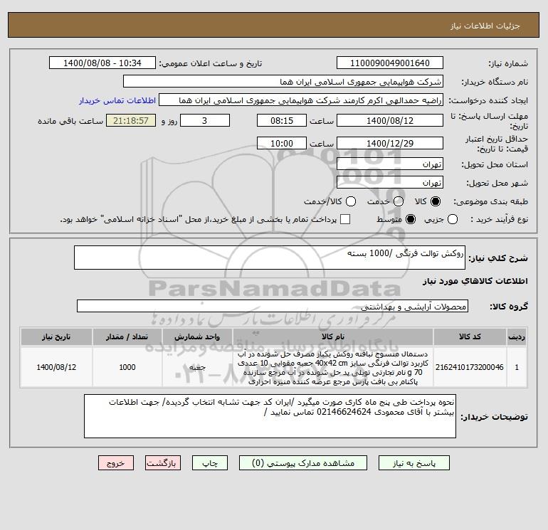 شرح کلی نیاز: روکش توالت فرنگی /1000 بسته