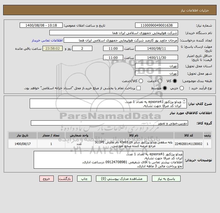 توضیحات خریدار:ویدئو پرژکتور epsonx41 یه تعداد 1 عدد. ایران کد صرفا جهت تشابه. اطلاعات بیشتر تماس با آقای شفیعی 09124708981 درساعت اداری. نحو پرداخت مالی 3 ماهه اداری.