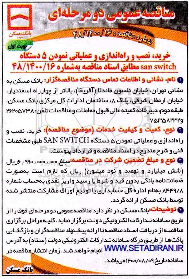 خرید،نصب و راه اندازی و عملیاتی نمودن 5 دستگاه san switch مطابق اسناد مناقصه به شماره 48/1400/16