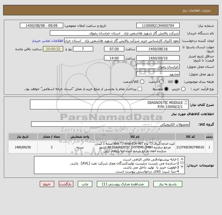 نام دستگاه خریدار:شرکت پالایش گاز شهید هاشمی نژاد استان خراسان رضوی