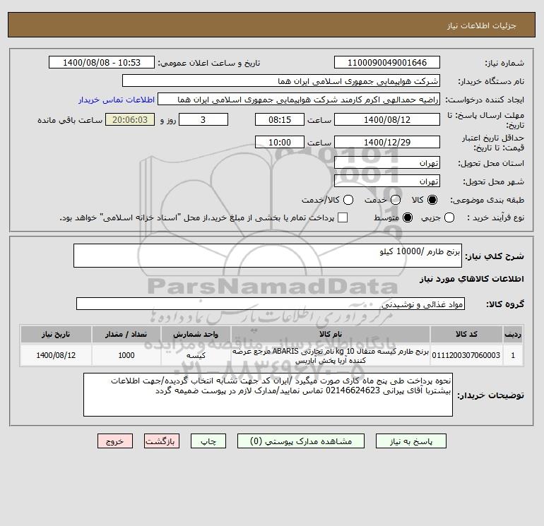 شرح کلی نیاز: برنج طارم /10000 کیلو
