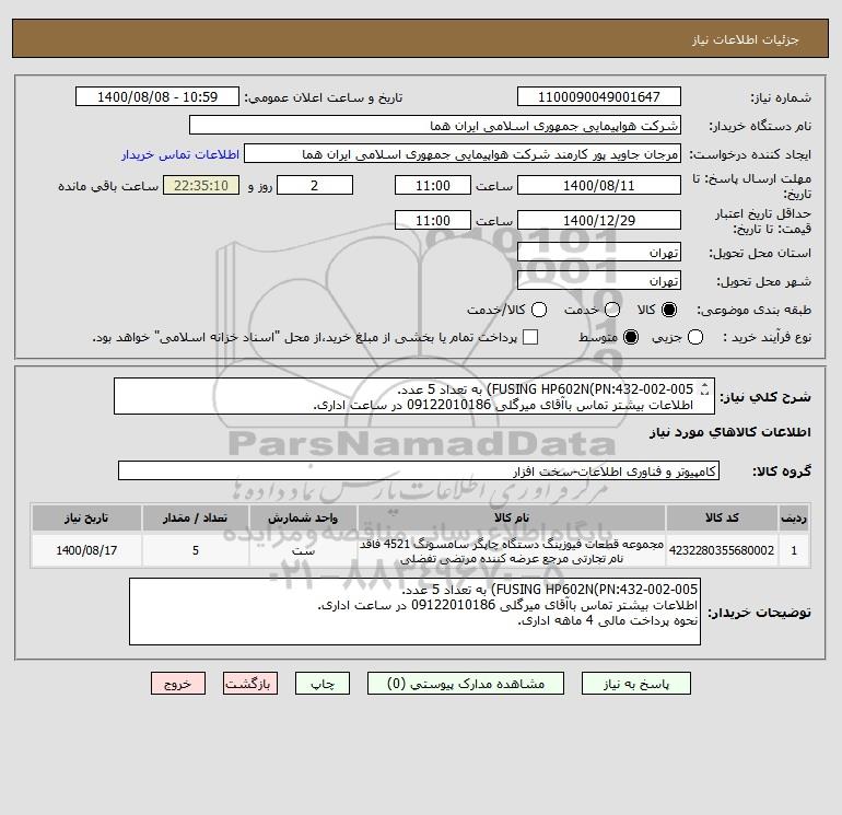 شرح کلی نیاز: FUSING HP602N(PN:432-002-005) به تعداد 5 عدد.