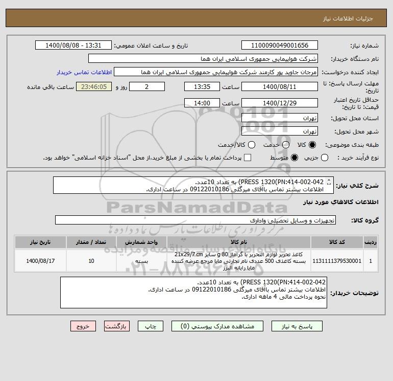 استعلام PRESS 1320(PN:414-002-042) به تعداد 10عدد. اطلاعات بیشتر تماس باآقای میرگلی 09122010186 در ساعت اداری. نحوه پرداخت مالی 4 ماهه اداری., استعلام PRESS 1320(PN:414-002-042) به تعداد 10عدد. اطلاعات بیشتر تماس باآقای میرگلی 09122010186 در ساعت اداری. نحوه پرداخت مالی 4 ماهه اداری.