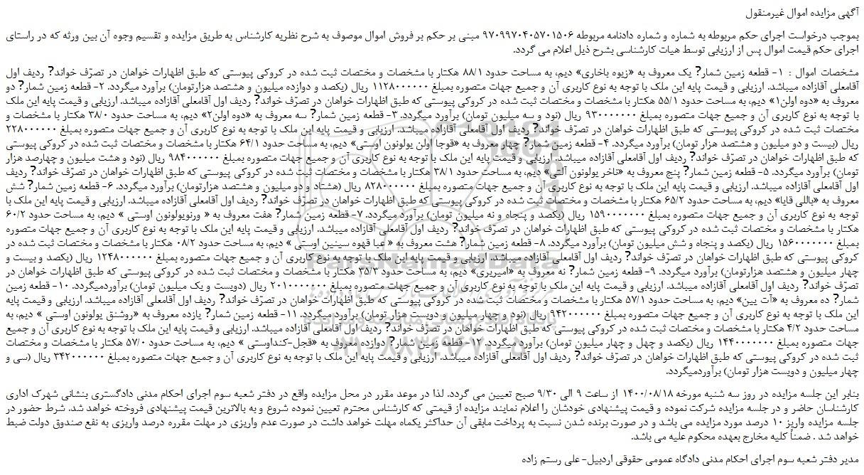 مشخصات اموال :  1- قطعه زمین شمار? یک معروف به «زیوه باخاری» دیم، به مساحت حدود 88/1 هکتار با مشخصات و مختصات ثبت شده در کروکی پیوستی که طبق اظهارات خواهان در تصرّف خواند? ردیف اول آقامعلی آقازاده میباشد. ارزیابی و قیمت پایه این ملک با توجه به نوع کاربری آن و جمیع جهات متصوره بمبلغ 1128000000 ریال (یکصد و دوازده میلیون و هشتصد هزارتومان) برآورد میگردد. 2- قطعه زمین شمار? دو معروف به «دوه اولن1» دیم، به مساحت حدود 55/1 هکتار با مشخصات و مختصات ثبت شده در کروکی پیوستی که طبق اظهارات خواهان در تصرّف خواند? ردیف اول آقامعلی آقازاده میباشد. ارزیابی و قیمت پایه این ملک با توجه به نوع کاربری آن و جمیع جهات متصوره بمبلغ 930000000 ریال (نود و سه میلیون تومان) برآورد میگردد. 3- قطعه زمین شمار? سه معروف به «دوه اولن2» دیم، به مساحت حدود 38/0 هکتار با مشخصات و مختصات ثبت شده در کروکی پیوستی که طبق اظهارات خواهان در تصرّف خواند? ردیف اول آقامعلی آقازاده میباشد. ارزیابی و قیمت پایه این ملک با توجه به نوع کاربری آن و جمیع جهات متصوره بمبلغ 228000000 ریال (بیست و دو میلیون و هشتصد هزار تومان) برآورد میگردد. 4- قطعه زمین شمار? چهار معروف به «قوجا اولن یولونون اوستی» دیم، به مساحت حدود 64/1 هکتار با مشخصات و مختصات ثبت شده در کروکی پیوستی که طبق اظهارات خواهان در تصرّف خواند? ردیف اول آقامعلی آقازاده میباشد. ارزیابی و قیمت پایه این ملک با توجه به نوع کاربری آن و جمیع جهات متصوره بمبلغ 984000000 ریال (نود و هشت میلیون و چهارصد هزار تومان) برآورد میگردد. 5- قطعه زمین شمار? پنج معروف به «ناخر یولونون آلتی» دیم، به مساحت حدود 38/1 هکتار با مشخصات و مختصات ثبت شده در کروکی پیوستی که طبق اظهارات خواهان در تصرّف خواند? ردیف اول آقامعلی آقازاده میباشد. ارزیابی و قیمت پایه این ملک با توجه به نوع کاربری آن و جمیع جهات متصوره بمبلغ 828000000 ریال (هشتاد و دو میلیون و هشتصد هزارتومان) برآورد میگردد. 6- قطعه زمین شمار? شش معروف به «باللی قایا» دیم، به مساحت حدود 65/2 هکتار با مشخصات و مختصات ثبت شده در کروکی پیوستی که طبق اظهارات خواهان در تصرّف خواند? ردیف اول آقامعلی آقازاده میباشد. ارزیابی و قیمت پایه این ملک با توجه به نوع کاربری آن و جمیع جهات متصوره بمبلغ 1590000000 ریال (یکصد و پنجاه و نه میلیون تومان) برآورد میگردد. 7- قطعه زمین شمار? هفت معروف به « ورنویولونون اوستی » دیم، به مساحت حدود 60/2 هکتار با مشخصات و مختصات ثبت شده در کروکی پیوستی که طبق اظهارات خواهان در تصرّف خواند? ردیف اول آقامعلی آقازاده میباشد. ارزیابی و قیمت پایه این ملک با توجه به نوع کاربری آن و جمیع جهات متصوره بمبلغ 1560000000 ریال (یکصد و پنجاه و شش میلیون تومان) برآورد میگردد. 8- قطعه زمین شمار? هشت معروف به « عبا قهوه سینین اوستی » دیم، به مساحت حدود 08/2 هکتار با مشخصات و مختصات ثبت شده در کروکی پیوستی که طبق اظهارات خواهان در تصرّف خواند? ردیف اول آقامعلی آقازاده میباشد. ارزیابی و قیمت پایه این ملک با توجه به نوع کاربری آن و جمیع جهات متصوره بمبلغ 1248000000 ریال (یکصد و بیست و چهار میلیون و هشتصد هزارتومان) برآورد میگردد. 9- قطعه زمین شمار? نه معروف به «امیریری» دیم، به مساحت حدود 35/3 هکتار با مشخصات و مختصات ثبت شده در کروکی پیوستی که طبق اظهارات خواهان در تصرّف خواند? ردیف اول آقامعلی آقازاده میباشد. ارزیابی و قیمت پایه این ملک با توجه به نوع کاربری آن و جمیع جهات متصوره بمبلغ 2010000000 ریال (دویست و یک میلیون تومان) برآوردمیگردد. 10- قطعه زمین شمار? ده معروف به «آت یین» دیم، به مساحت حدود 57/1 هکتار با مشخصات و مختصات ثبت شده در کروکی پیوستی که طبق اظهارات خواهان در تصرّف خواند? ردیف اول آقامعلی آقازاده میباشد. ارزیابی و قیمت پایه این ملک با توجه به نوع کاربری آن و جمیع جهات متصوره بمبلغ 942000000 ریال (نود و چهار میلیون و دویست هزار تومان) برآورد میگردد. 11- قطعه زمین شمار? یازده معروف به «روشنق یولونون اوستی » دیم، به م