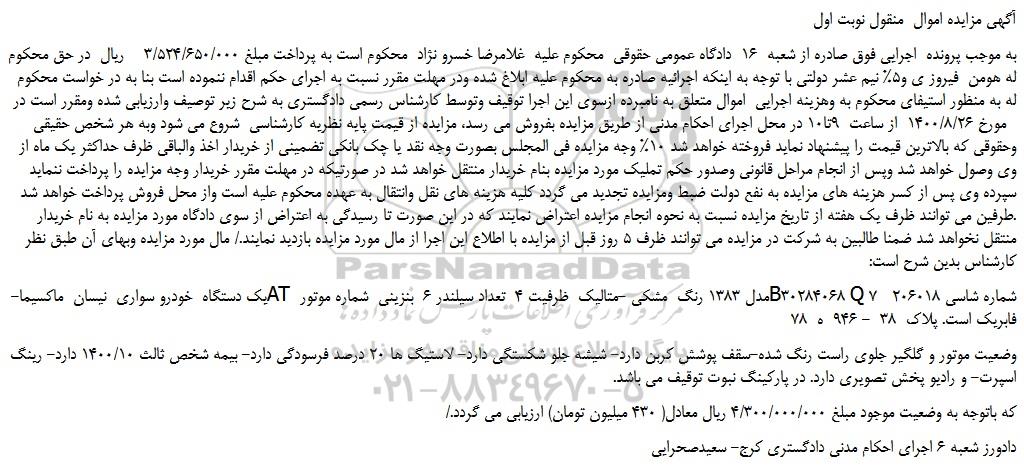 به موجب پرونده اجرایی فوق صادره از شعبه 16 دادگاه عمومی حقوقی محکوم علیه غلامرضا خسرو نژاد محکوم است به پرداخت مبلغ 3/524/650/000 ریال در حق محکوم له هومن فیروز ی و5% نیم عشر دولتی با توجه به اینکه اجرائیه صادره به محکوم علیه ابلاغ شده ودر مهلت مقرر نسبت به اجرای حکم اقدام ننموده است بنا به در خواست محکوم له به منظور استیفای محکوم به وهزینه اجرایی اموال متعلق به نامبرده ازسوی این اجرا توقیف وتوسط کارشناس رسمی دادگستری به شرح زیر توصیف وارزیابی شده ومقرر است در مورخ 1400/8/26 از ساعت 9تا10 در محل اجرای احکام مدنی از طریق مزایده بفروش می رسد، مزایده از قیمت پایه نظریه کارشناسی شروع می شود وبه هر شخص حقیقی وحقوقی که بالاترین قیمت را پیشنهاد نماید فروخته خواهد شد 10% وجه مزایده فی المجلس بصورت وجه نقد یا چک بانکی تضمینی از خریدار اخذ والباقی ظرف حداکثر یک ماه از وی وصول خواهد شد وپس از انجام مراحل قانونی وصدور حکم تملیک مورد مزایده بنام خریدار منتقل خواهد شد در صورتیکه در مهلت مقرر خریدار وجه مزایده را پرداخت ننماید سپرده وی پس از کسر هزینه های مزایده به نفع دولت ضبط ومزایده تجدید می گردد کلیه هزینه های نقل وانتقال به عهده محکوم علیه است واز محل فروش پرداخت خواهد شد .طرفین می توانند ظرف یک هفته از تاریخ مزایده نسبت به نحوه انجام مزایده اعتراض نمایند که در این صورت تا رسیدگی به اعتراض از سوی دادگاه مورد مزایده به نام خریدار منتقل نخواهد شد ضمنا طالبین به شرکت در مزایده می توانند ظرف 5 روز قبل از مزایده با اطلاع این اجرا از مال مورد مزایده بازدید نمایند./ مال مورد مزایده وبهای آن طبق نظر کارشناس بدین شرح است: