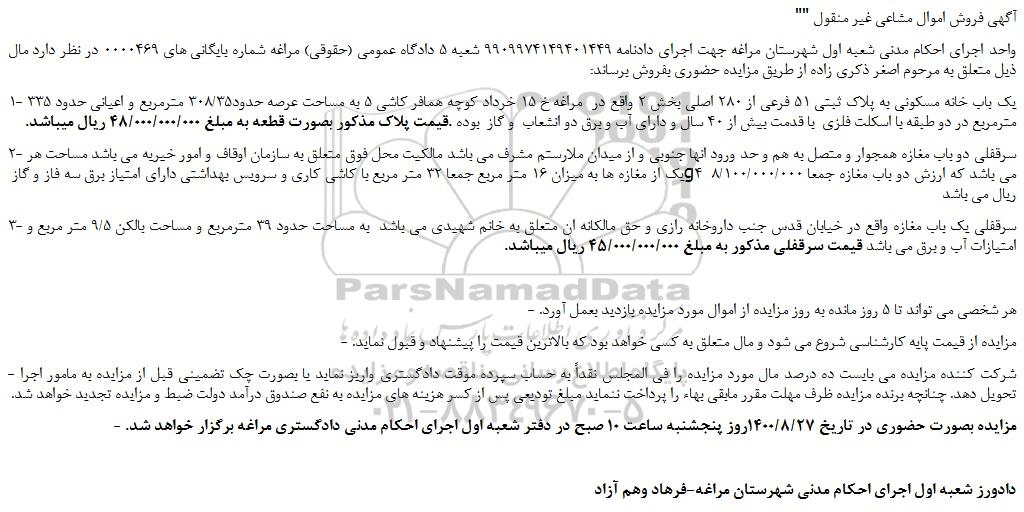 - مزایده بصورت حضوری در تاریخ 1400/8/27روز پنجشنبه ساعت 10 صبح در دفتر شعبه اول اجرای احکام مدنی دادگستری مراغه برگزار خواهد شد