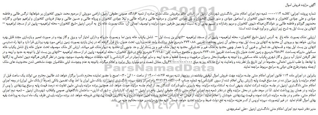 شماره پرونده اجرایی: کلاسه 0000114 شعبه دوم اجرای احکام مدنی دادگستری شهرستان اردبیل در راستای حکم برفروش ملک مشاع صادره از شعبه 6دادگاه عمومی حقوقی اردبیل ،اراضی موروثی از مرحوم محمد دنیوی کلخوران بر خواهانها: نرگس طالبی و فاطمه جوادی و علی جوادی کلخوران و خدیجه دنیوی کلخوران و اسماعیل جوادی و منور دنیوی کلخوران و ولی جوادی کلخوران و مرضیه طالبی و فرزانه طالبی و لیلا جوادی کلخوران و پروانه طالبی و حسین طالبی و مهناز فریادی کلخوران و ابراهیم جوادی و گلزاده محمدپور گوزللو و فاطمه طالبی بر خواندگان:عبداله دنیوی کلخوران و مریم رضازاده و تقسیم بهای آن به نسبت سهم بین طرفین ،مورد مزایده و توصیف اجمالی آن: ملک بصورت خانه باغ به آدرس اردبیل-شیخ کلخوران- محله ابراهیمیه- پایین تر از مسجد ابراهیمیه –انتهای بن بست اول به شرح زیر ارزیابی و برآورد قیمت شده است؛