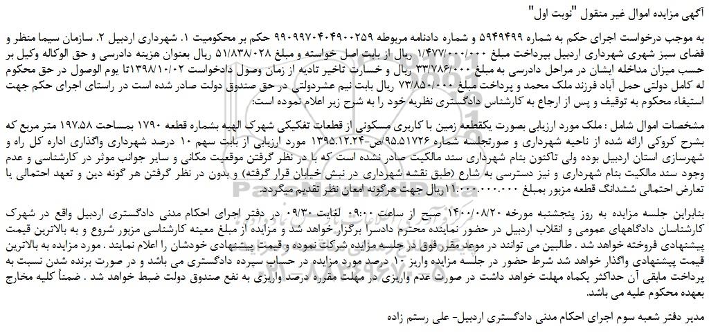 به موجب درخواست اجرای حکم به شماره 5949499 و شماره دادنامه مربوطه 9909970404900259 حکم بر محکومیت 1. شهرداری اردبیل 2. سازمان سیما منظر و فضای سبز شهری شهرداری اردبیل بپرداخت مبلغ 1/477/000/000 ریال از بابت اصل خواسته و مبلغ 51/838/028 ریال بعنوان هزینه دادرسی و حق الوکاله وکیل بر حسب میزان مداخله ایشان در مراحل دادرسی به مبلغ 33/786/000 ریال و خسارت تاخیر تادیه از زمان وصول دادخواست 1398/10/02تا یوم الوصول در حق محکوم له کامل دولتی حمل آباد فرزند ملک محمد و پرداخت مبلغ 73/850/000 ریال بابت نیم عشردولتی در حق صندوق دولت صادر شده است در راستای اجرای حکم جهت استیفاء محکوم به توقیف و پس از ارجاع به کارشناس دادگستری نظریه خود را به شرح زیر اعلام نموده است: