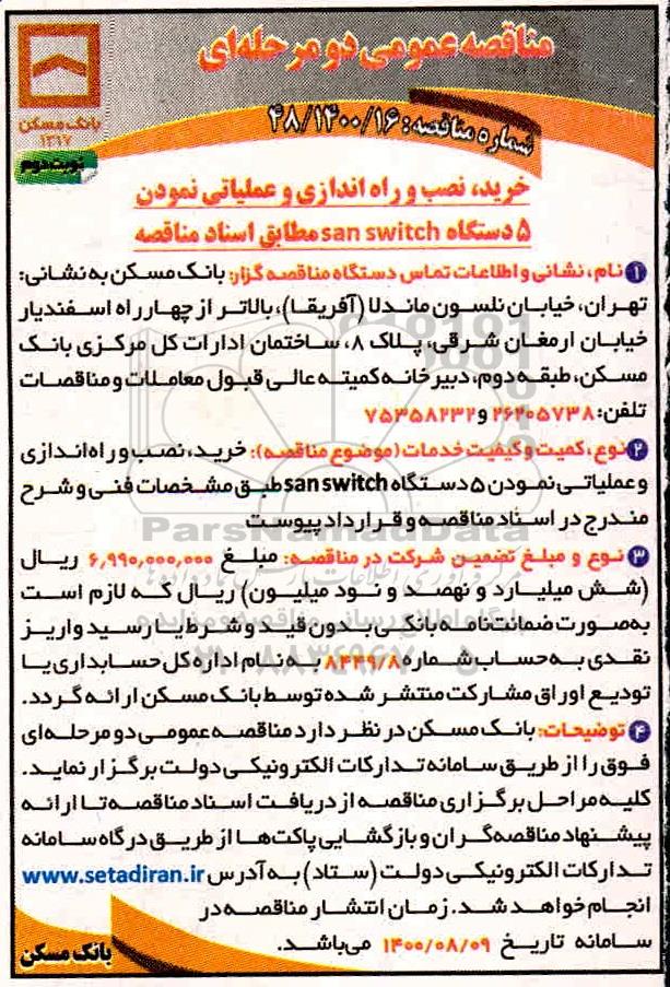 خرید،نصب و راه اندازی و عملیاتی نمودن 5 دستگاه san switch  مطابق اسناد مناقصه به شماره 48/1400/16