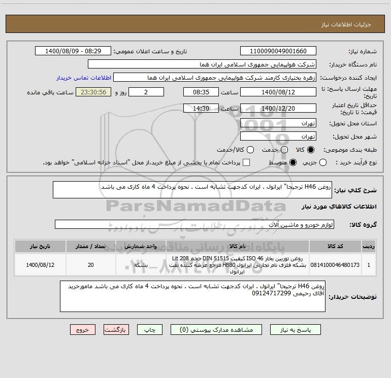 توضیحات خریدار:روغن H46 ترجیحا" ایرانول . ایران کدجهت تشابه است . نحوه پرداخت 4 ماه کاری می باشد مامورخرید آقای رحیمی 09124717299