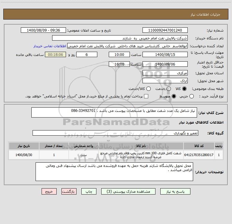 استعلام نیاز شامل یک عدد شفت مطابق با مشخصات پیوست می باشد . 33492701-086, استعلام نیاز شامل یک عدد شفت مطابق با مشخصات پیوست می باشد . 33492701-086