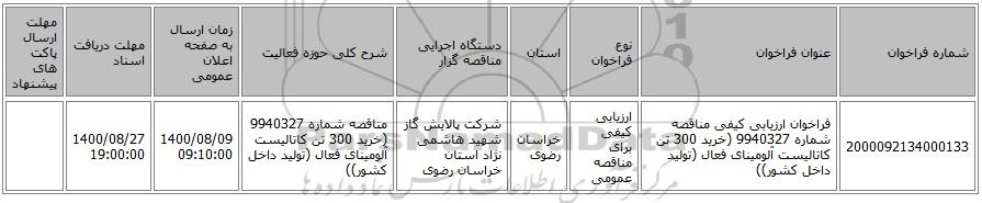 | 2000092134000133 | فراخوان ارزیابی کیفی مناقصه شماره 9940327 (خرید 300 تن کاتالیست آلومینای فعال (تولید داخل کشور)) | ارزیابی کیفی برای مناقصه عمومی | خراسان رضوی | شرکت پالایش گاز شهید هاشمی نژاد استان خراسان رضوی | مناقصه شماره 9940327 (خرید 300 تن کاتالیست آلومینای فعال (تولید داخل کشور)) | 1400/08/09 09:10:00 | 1400/08/27 19:00:00 |