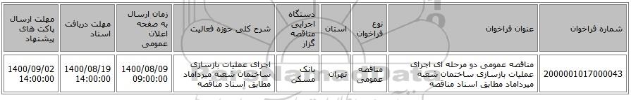 2000001017000043 | مناقصه عمومی دو مرحله ای اجرای عملیات بازسازی ساختمان شعبه میرداماد مطابق اسناد مناقصه | مناقصه عمومی | تهران | بانک مسکن | اجرای عملیات بازسازی ساختمان شعبه میرداماد مطابق اسناد مناقصه | 1400/08/09 09:00:00 | 1400/08/19 14:00:00 | 1400/09/02 14:00:00 |