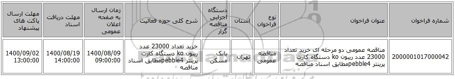 مناقصه، مناقصه عمومی دو مرحله ای خرید تعداد 23000 عدد ریبون ko دستگاه کارت پرینتر pebble4مطابق اسناد مناقصه از کلیه افراد متخصص و شرکتها واجد شرایط دعوت به عمل میآید در مناقصه با کد خبرگزاری پارس نماد: 3899854 شرکت نمایند.