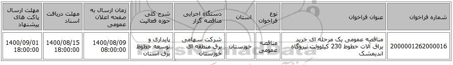 | 2000001262000016 | مناقصه عمومی یک مرحله ای خرید یراق آلات خطوط 230 کیلوولت نیروگاه اندیمشک | مناقصه عمومی | خوزستان | شرکت سهامی برق منطقه ای خوزستان | پایداری و توسعه خطوط برق استان | 1400/08/09 08:00:00 | 1400/08/15 18:00:00 | 1400/09/01 18:00:00 |