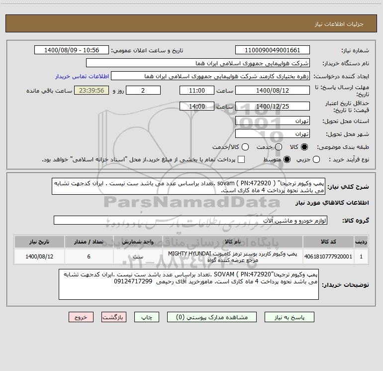 شرح کلی نیاز: پمپ وکیوم ترجیحا" ( sovam ( PN:472920 .تعداد براساس عدد می باشد ست نیست . ایران کدجهت تشابه می باشد نحوه پرداخت 4 ماه کاری است.