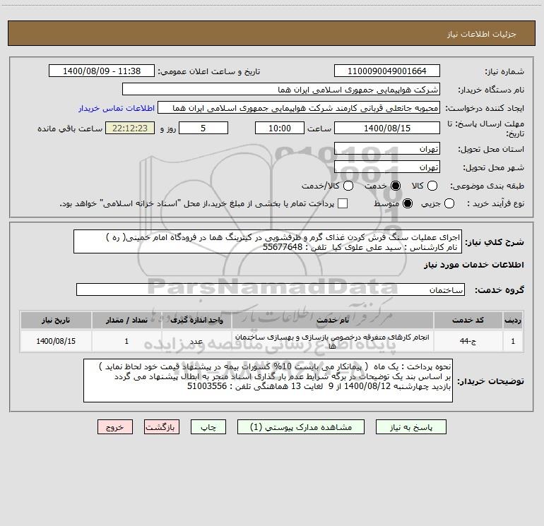 شرح کلی نیاز: اجرای عملیات سنگ فرش کردن غذای گرم و ظرفشویی در کیترینگ هما در فرودگاه امام خمینی( ره )